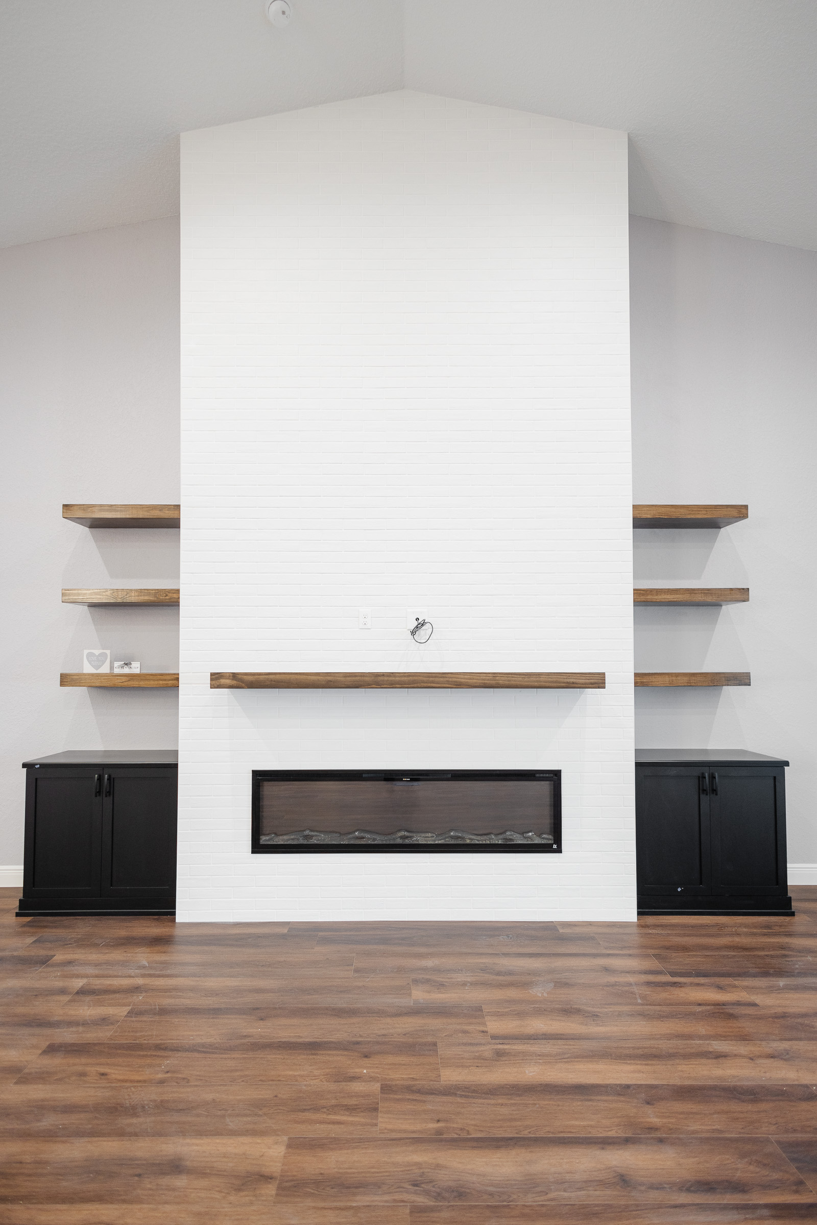 A floor-to-ceiling fireplace feature wall creates a dramatic focal point in the main living space, combining clean lines with warm wood accents and built-in storage.