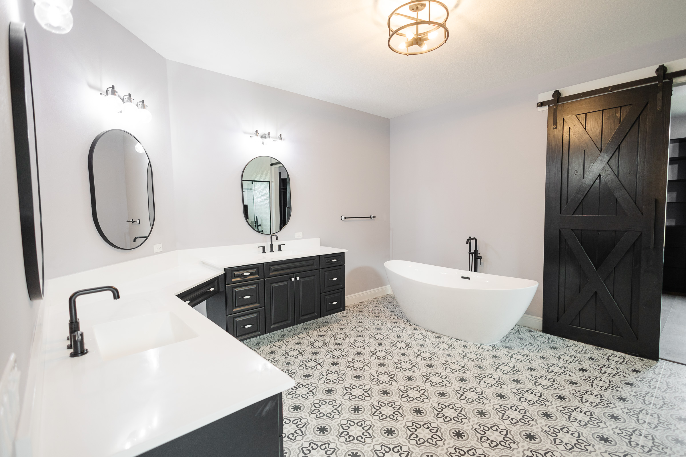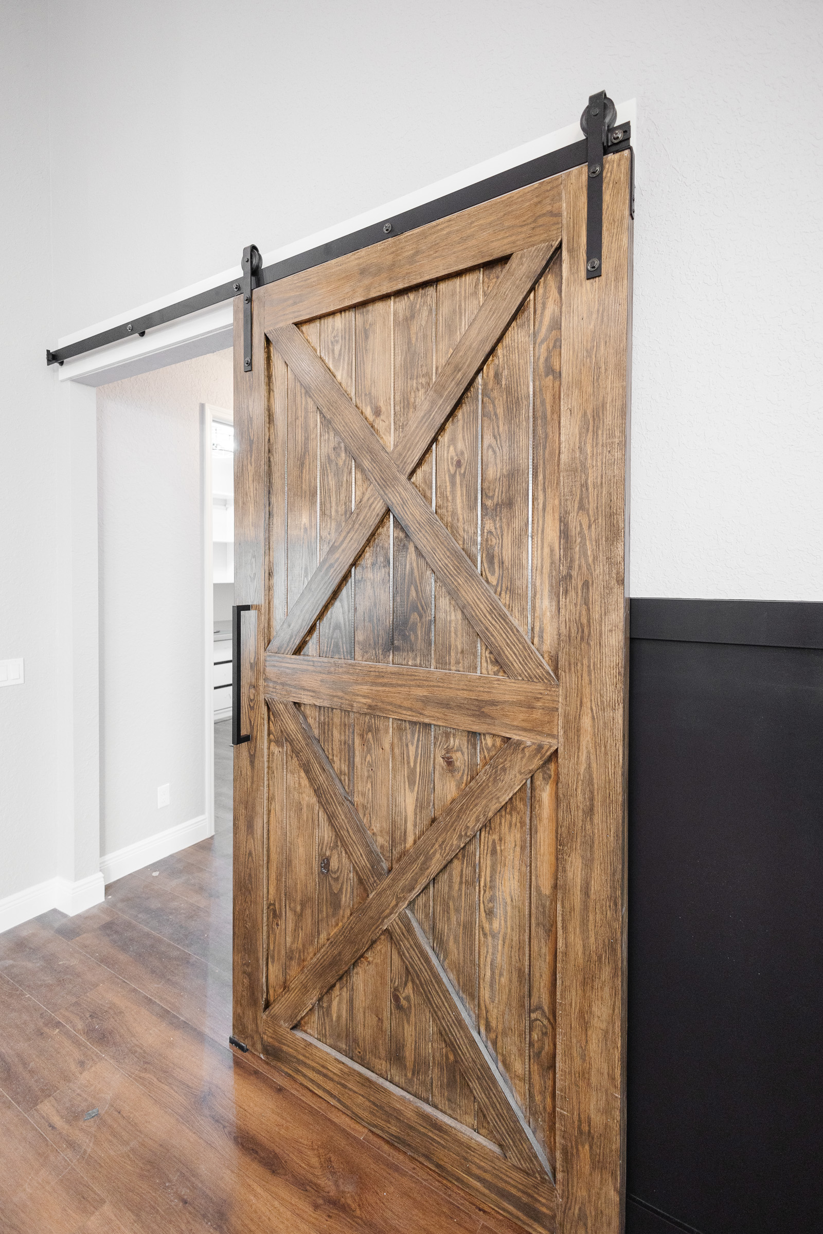 Thoughtful custom details like wood barn doors, floating shelves, and tailored trim elements add character throughout the home while reinforcing its warm country-style influence.