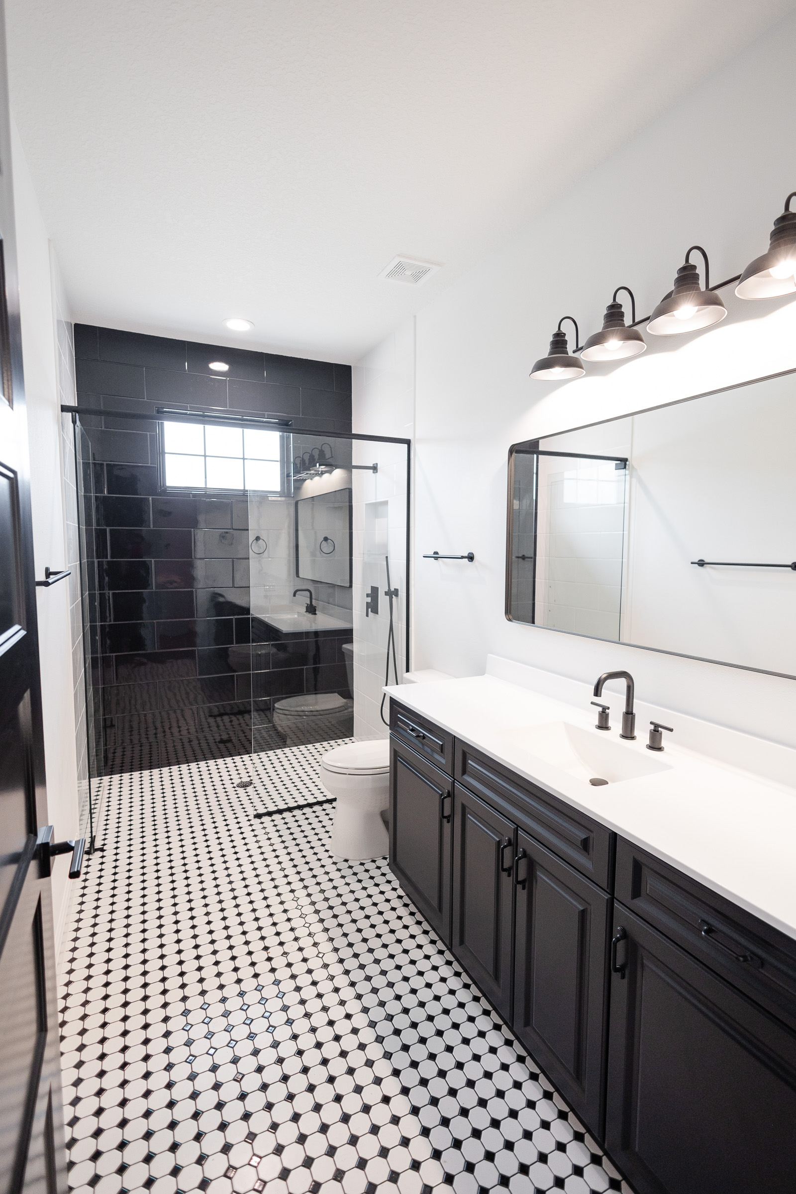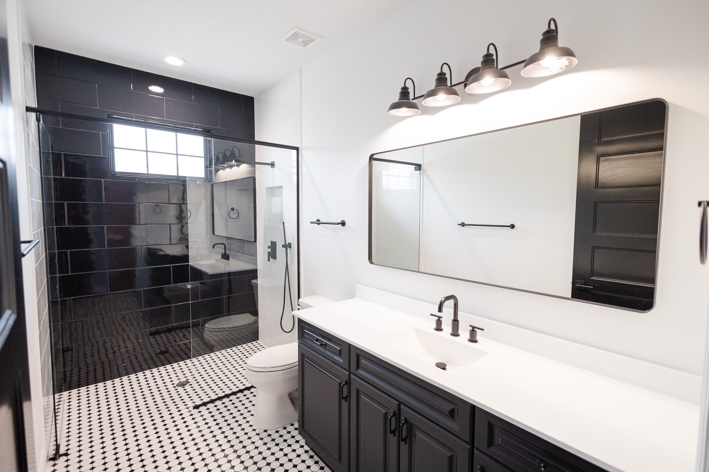A crisp exterior palette, strong rooflines, covered front porch, and bold window detailing give this home timeless curb appeal with a clean modern farmhouse feel.